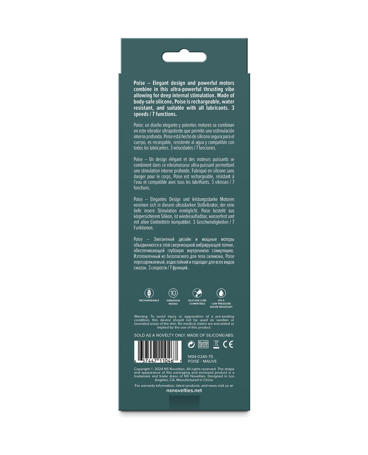 Poise - Elegant design and powerful motors combine in this ultra-powerful thrusting vibe allowing for deep internal stimulation. Made of body-safe silicone, Poise is rechargeable, water resistant, and suitable with all lubricants. 3 speeds / 7 functions.