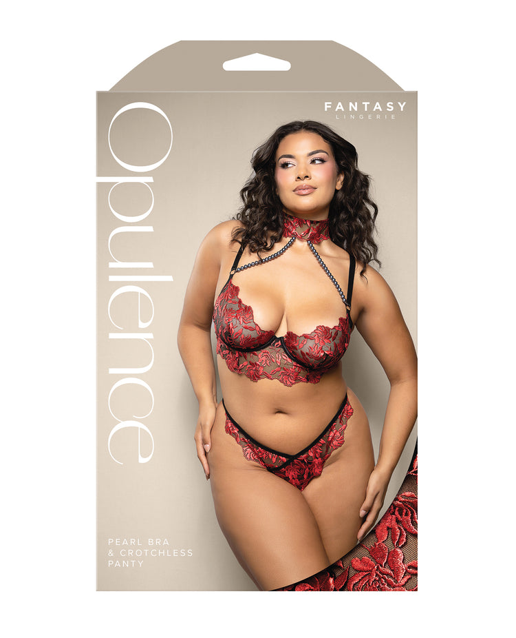 Command attention with every step in the Opulence Embroidered Underwire Bralette & Crotchless Panty Set – Queen Size, a sensual red duo crafted to celebrate your curves. The vibrant floral embroidered bralette features supportive underwire cups and a removable pearl choker that adds an exquisite touch of decadence. The matching crotchless panty showcases a flirty pearl strand detail, perfectly placed to tease and tantalize.