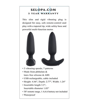 This slim and rigid vibrating plug is designed for easy, safe remote-control anal play with a tapered tip, wide safety base and powerful multi-function motor.
