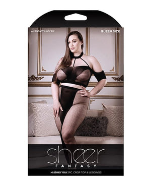 Step into bold, edgy fashion with the Sheer Fantasy Missing You Opaque & Net Off-Shoulder Top with Leggings - Black (Queen Size). This striking ensemble features a cold-shoulder crop top with a captivating mix of opaque and fishnet panels, designed to highlight your curves while exuding confidence and allure. The matching footless leggings complete the look, creating a seamless and sophisticated silhouette that’s perfect for special nights or daring daytime wear. Crafted from a soft, stretchy blend of nylon and spandex, this set provides a comfortable and flattering fit for curvier body types. Available in Queen Size (14-18), it’s tailored to enhance your natural shape with a perfect blend of coverage and bold style.