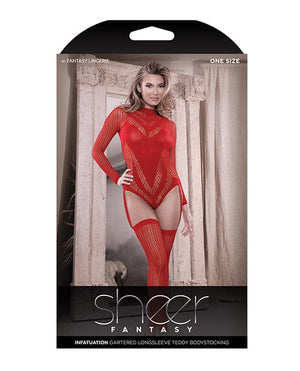Ignite your inner fire with the Sheer Infatuation Long Sleeve Teddy with Attached Footless Stockings - Red. This stunning long sleeve teddy bodystocking is designed to embrace your curves with its figure-hugging silhouette and vibrant red hue. Featuring a gartered style with attached footless stockings, this piece exudes a seamless, sophisticated look that accentuates your legs and adds a touch of daring allure. Crafted from a soft and stretchy blend of nylon and spandex, this bodystocking offers a comfortable, form-fitting design that moves with your body. Perfect for romantic nights or special occasions, this ensemble is available in One Size (2-12), designed to flatter a range of body types and make you feel irresistible.