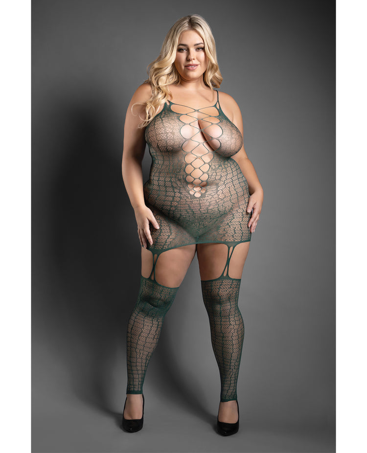 Sheer Wild Heart Reptile Print Bodystocking Dress w/Attached Stockings - Green QN